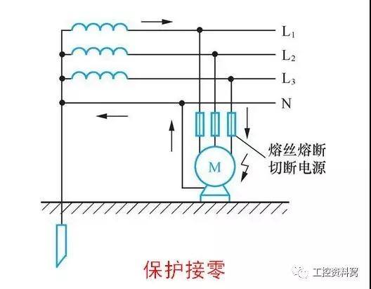 在電壓低于1000伏的接零電網(wǎng)中,若電工設(shè)備因絕緣損壞或意外情況而使金屬外殼帶電時,形成相線對中性線的單相短路,則線路上的保護(hù)裝置(自動開關(guān)或熔斷器)迅速動作,切斷電源,從而使設(shè)備的金屬部分不至于長時間存在危險的電壓,這就保證了人身安全。