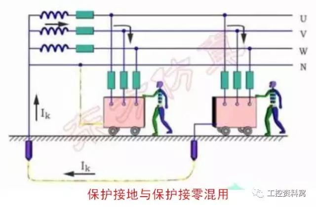 (6)在同一低壓電網(wǎng)中,保護(hù)接地與保護(hù)接零不能混合使用。否則,如果接地設(shè)備發(fā)生故障,零線電位就會被升高。對于電壓來說,其接觸電壓與相電壓相當(dāng),使得觸電的危險性進(jìn)一步增加。